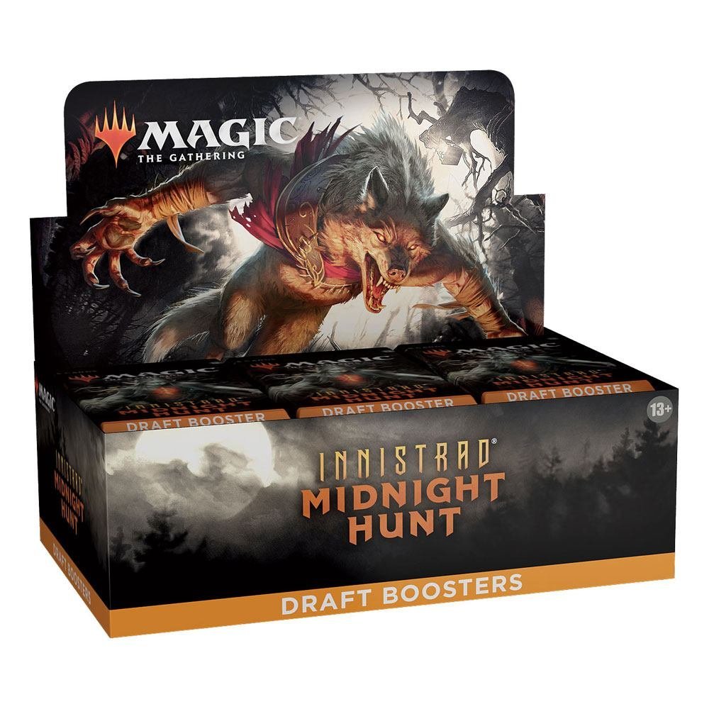Magic The Gathering Innistrad Midnight Hunt Draft Booster Display 36 English to zestaw 36 boosterów z najnowszą edycją kart do gry Magic The Gathering, inspirowaną mrocznymi opowieściami o wilkołakach i innych potworach z uniwersum Innistrad. Każdy booster zawiera 15 losowych kart, w tym jedną rzadką lub mytologiczną, co sprawia, że otwieranie każdego z nich to niezwykłe przeżycie pełne napięcia i emocji.