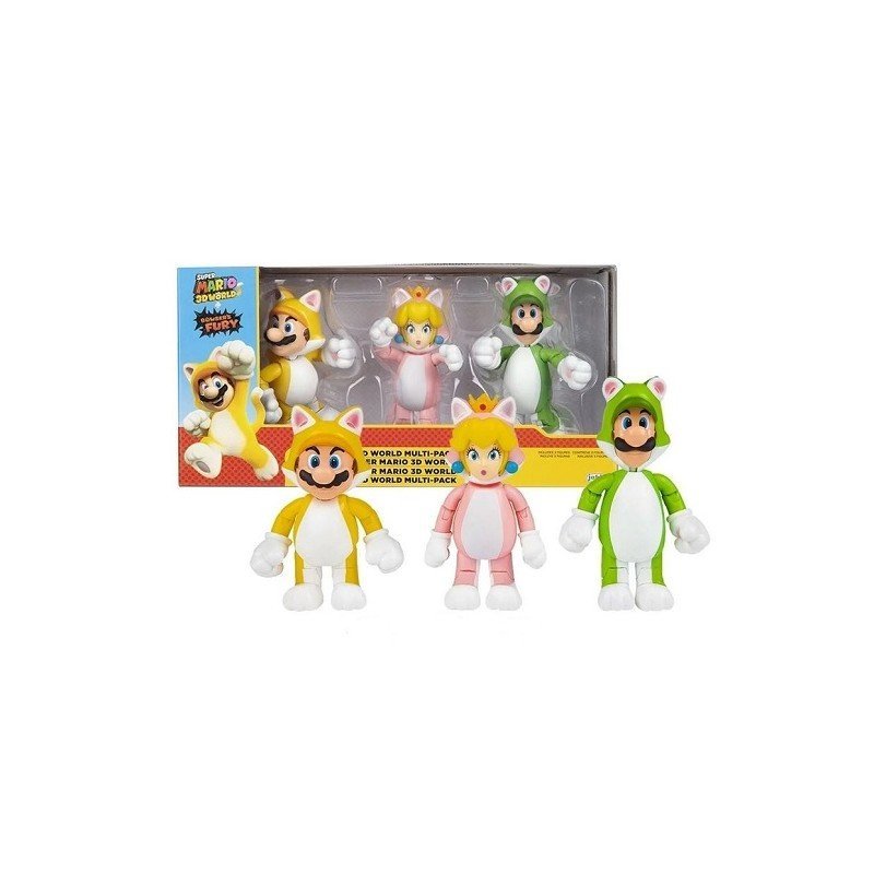 Super Mario 3 Pack Action Figures 3D Worlds Mario Cat Fury Nintendo 10 Cm